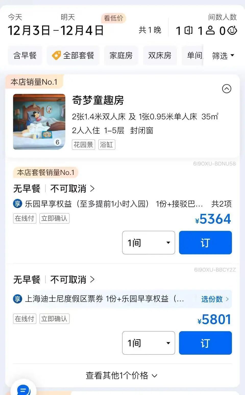 公开信息显示,上海迪士尼乐园酒店于2016年正式开业,其12月客房最低价格为3551元/晚。来源:极目新闻